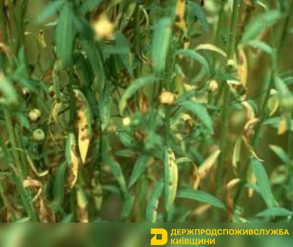 Хвороба вражає всі надземні органи рослини, перші ознаки захворювання проявляються у вигляді жовтувато-зелених плям на сім’ядолях. Пізніше ці плями дуже швидко поширюються сім’ядольним листочком і стають коричневими. Листочки покриваються великою кількістю темних крапок (пікнід), надалі плями з пікнідами з’являються на справжньому листі. Поступово плями на листі світлішають у центрі. Інфіковане листя опадає, оголюючи стебло знизу, а хвороба переходить на верхнє листя та стебла рослин. На стеблах рослин утворюються розпливчасті коричневі, видовжені плями. Чергування здорових і уражених ділянок стебла надає йому строкатого вигляду, що є характерною ознакою хвороби. Бутони та молоді коробочки при зараженні в’януть і опадають.